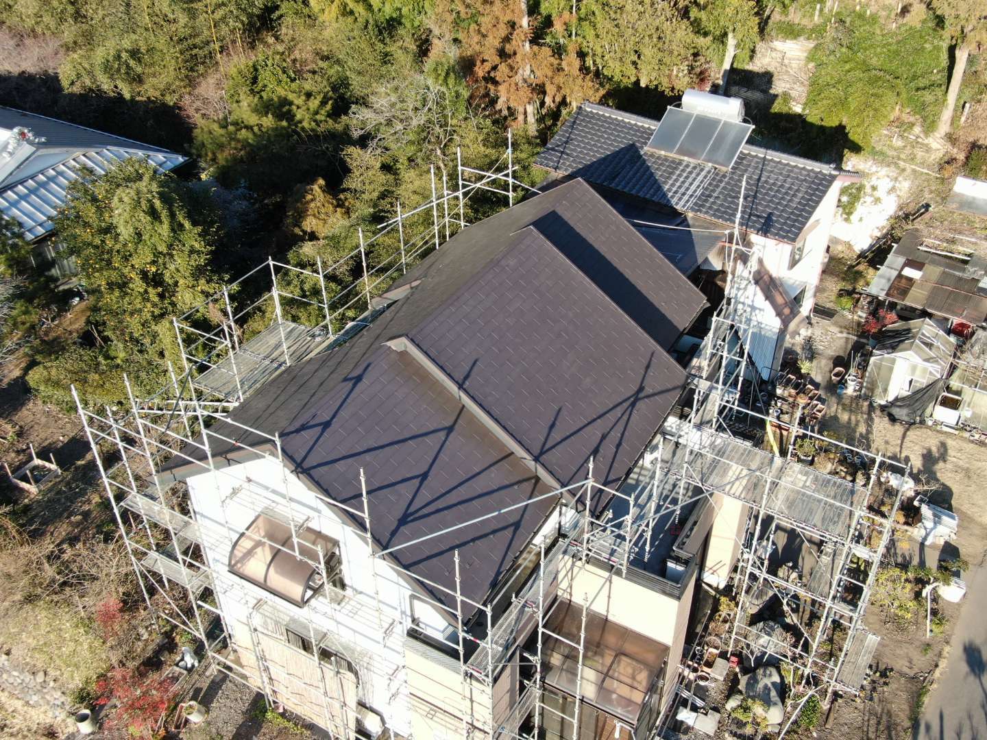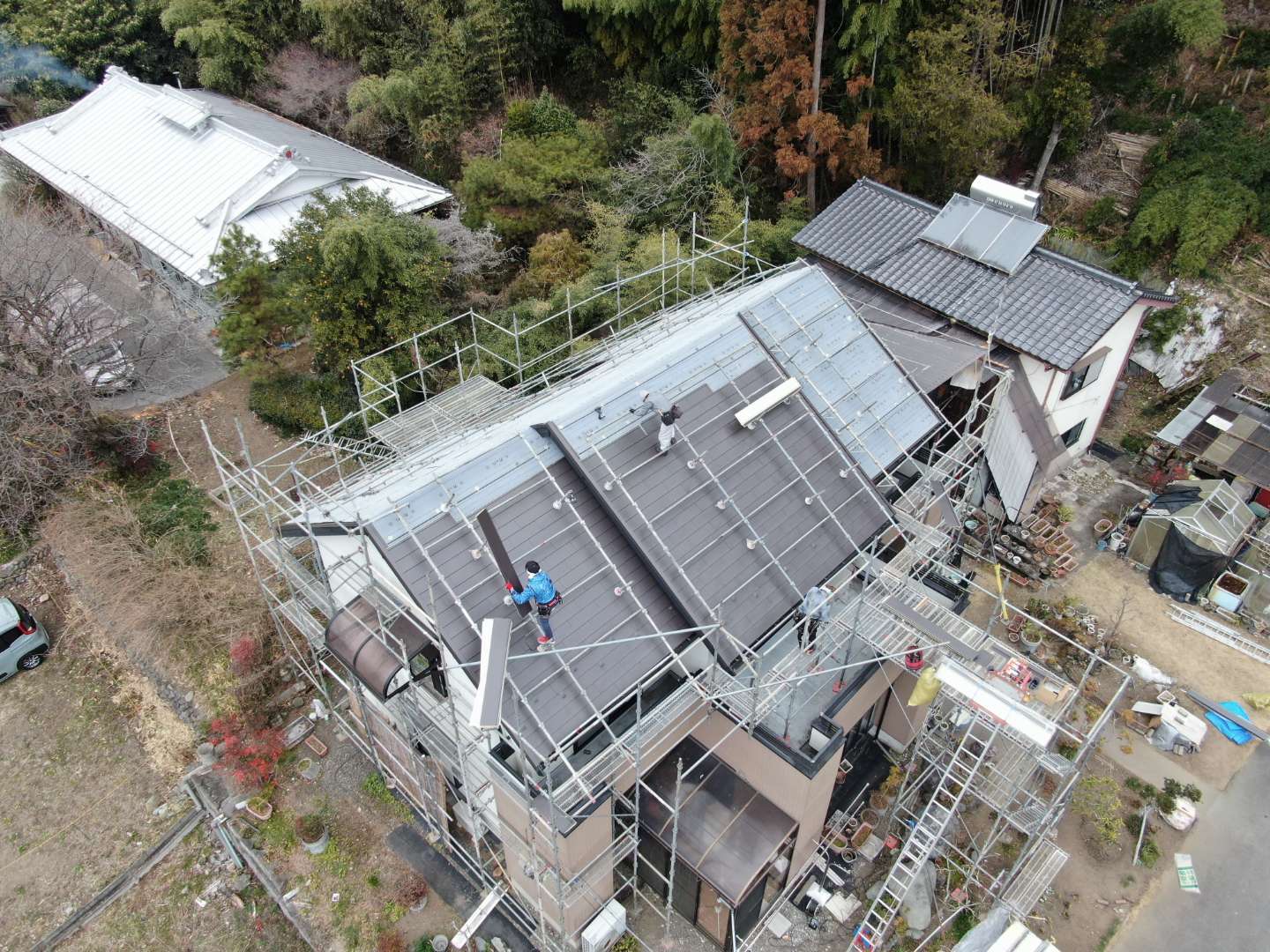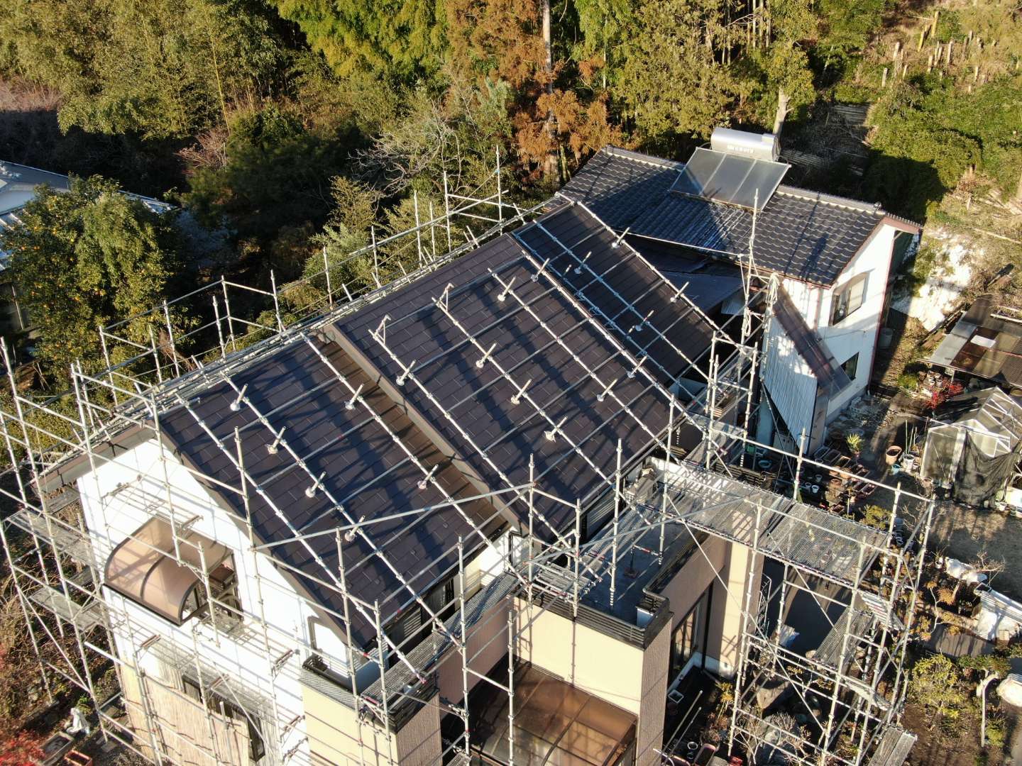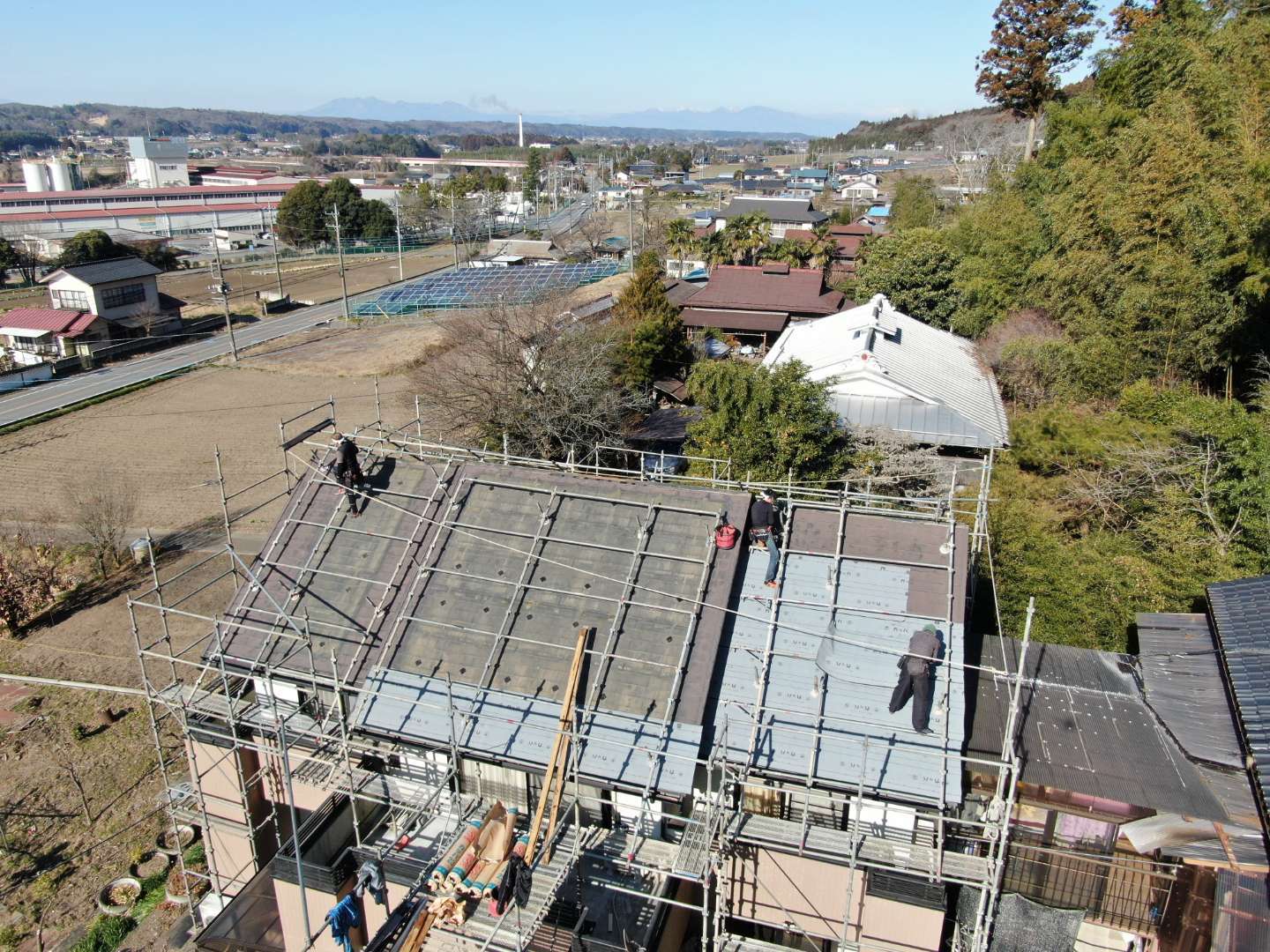 されてるのでそれを撤去してからの工事です。ソーラーパネルを撤去したところだけ色が違って見えます。